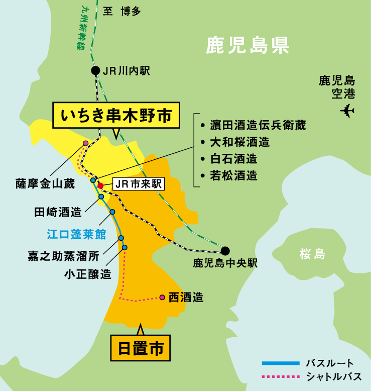 市来駅→バスタST(濵田酒造伝兵衛蔵・大和桜酒造・白石酒造・若松酒造へ徒歩圏内)→田崎酒造→江口蓬莱館→小正醸造【折返し】→江口蓬莱館→田崎酒造→バスタST(濵田酒造伝兵衛蔵・大和桜酒造・白石酒造・若松酒造へ徒歩圏内)→市来駅